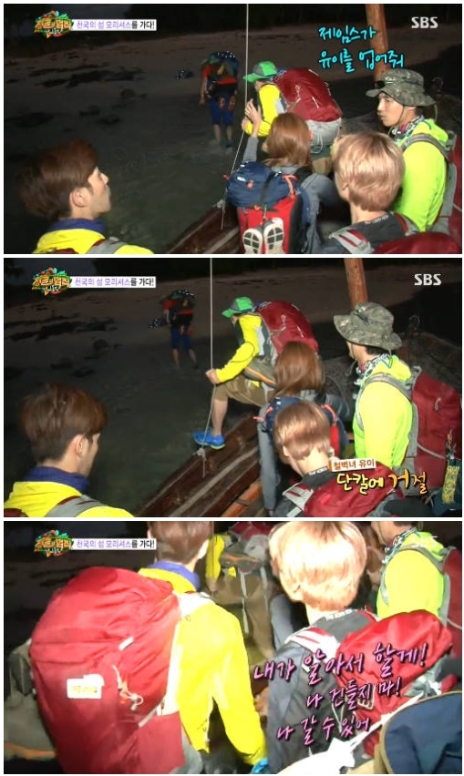 병만족은 작은 보트로 이동했고, 얕은 수심으로 보트는 섬 가까이에 정박할 수 없었다. 이에 일부 멤버들은 누군가에게 업혀 움직였다. "유이는 제임스가 업어줘라"라는 강지섭의 말에 유이는 "나 건들지마. 내가 알아서 할거야"라며 단칼에 거절했다.