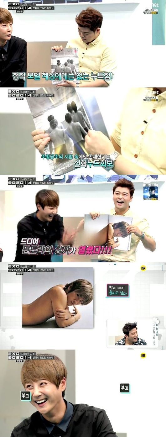 이민우, 신혜성은 29일 오후 방송된 Mnet 예능프로그램 '엑소 902014'에서 스튜디오에 누드집이 등장하자 당황한 기색을 감추지 못했다. 이어 엑소가 관심을 보이자 이민우는 "형들 엉덩이 봐서 뭐하냐"고 말해 웃음을 자아냈다.