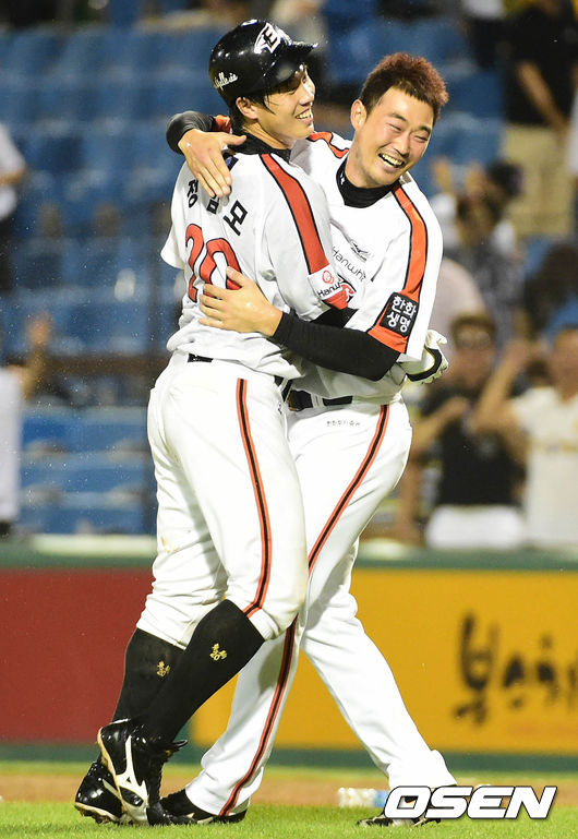 28일 대전야구장에서 벌어진 '2014 한국 야쿠르트세븐 프로야구' 한화 이글스와 넥센 히어로즈의 경기, 10회말 1사 만루 한화 정범모가 끝내기 밀어내기를 얻어 10-9의 대역전승을 거두었다. 한화 선수들이 승리의 기쁨을 나누고 있다.