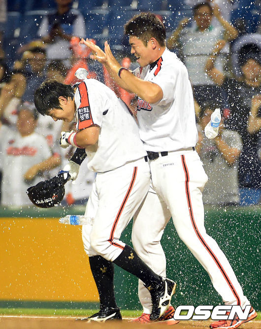 28일 대전야구장에서 벌어진 '2014 한국 야쿠르트세븐 프로야구' 한화 이글스와 넥센 히어로즈의 경기, 10회말 1사 만루 한화 정범모가 끝내기 밀어내기를 얻어 10-9의 대역전승을 거두었다. 한화 선수들이 승리의 기쁨을 나누고 있다.