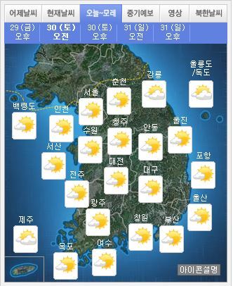 30일에는 동해북부해상에 위치한 고기압의 영향을 받겠다. 전국이 대체로 맑겠으나, 제주도는 가끔 구름이 많을 것으로 예상된다.