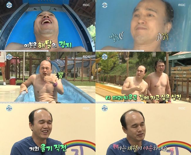 그는 이날 육중완과 함께 워터파크를 방문, 각종 놀이기구를 타며 재밌는 시간을 보냈다. 하지만 금세 지쳤고 특히 무서운 놀이기구를 타며 그는 급 노화된 모습을 보이고 말았다.