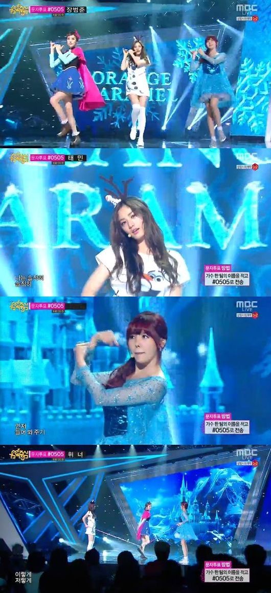 이날 오렌지캬라멜은 '겨울왕국'의 캐릭터로 변신했다. 레이나가 엘사, 리지가 안나, 나나는 올라프로 분했다.