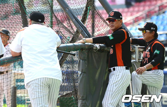 30일 오후 서울 잠실구장에서 열리는 '2014 한국야쿠르트 세븐 프로야구' LG 트윈스와 롯데 자이언츠의 경기 시작전 김시진 감독의 선수들의 훈련을 지켜보고 있다.