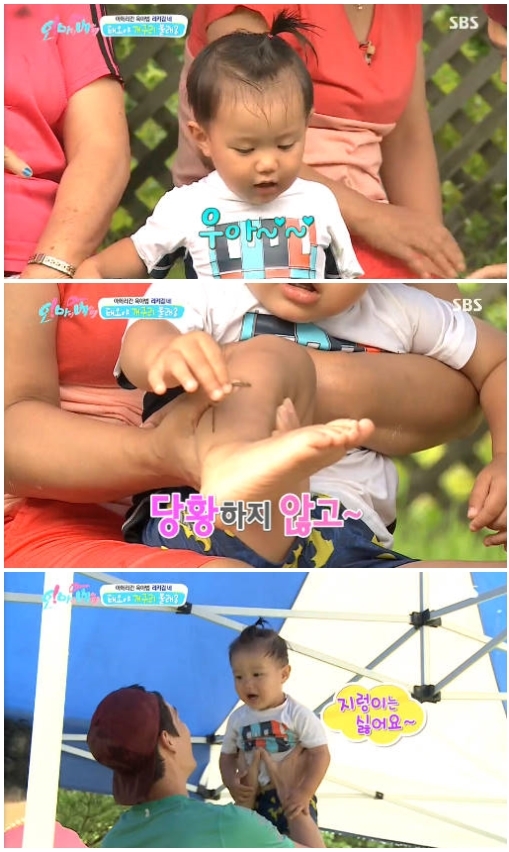 외할아버지는 태오에게 지렁이와 개구리를 보여줬다. 외할아버지는 태오의 발에 지렁이를 올려놓았고, 태오는 당황하지 않고 지렁이를 들어올려 내다버렸다. 반면 개구리에 대해서는 다소 경계하는 태세를 보여 웃음을 자아냈다.