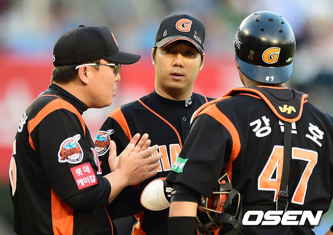 30일 오후 서울 잠실구장에서 열린 '2014 한국야쿠르트 세븐 프로야구' LG 트윈스와 롯데 자이언츠의 경기 1회말 1사 만루 이진영에게 2타점 적시타를 허용한 장원준이 주형광 코치와 이야기를 나누고 있다.