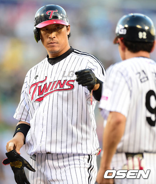 30일 오후 서울 잠실구장에서 열린 '2014 한국야쿠르트 세븐 프로야구' LG 트윈스와 롯데 자이언츠의 경기 1회말 1사 1,3루 이병규가 1타점 적시타를 치고 김민호 코치와 하이파이브를 하고 있다.