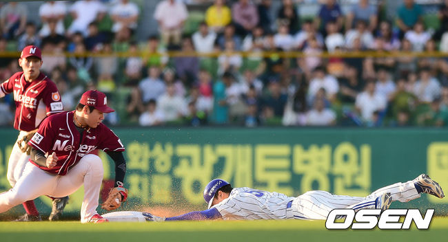 1회말 삼성 공격 1사 1루 상황 박한이 타석 때 주자 박해민이 2루 도루에 성공하고 있다. 넥센 유격수는 강정호.