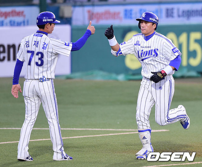 2회말 삼성 공격 선두타자로 나선 이승엽이 우월 솔로포를 날리고 그라운드를 돌며 김재걸 코치와 인사를 나누고 있다.