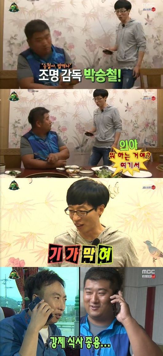 어안이 벙벙한 유재석은 스태프에게 "뭐하는 거냐. 여기서"라고 물었고, 스태프는 "명수 형이 먹으라고 했다"고 능청스레 대답했다.