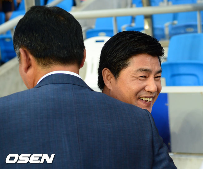 크 경기, '현대오일뱅크 K리그 클래식 2014' 23라운드 경기, 경기 전 부산 윤성효 감독이 인천 김봉길 감독과 악수를 나누고 있다.