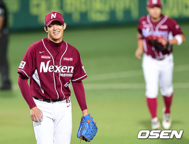 4회초 삼성 공격을 삼자범퇴로 막아낸 넥센 선발 김대우가 동료들을 향해 미소지으며 더그아웃으로 들어오고 있다.