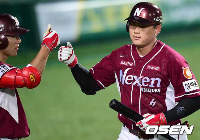 5회초 넥센 공격 무사 1루 상황 이성열이 역전 좌월 투런포를 날리고 홈을 밟은 뒤 서건창과 인사를 나누고 있다.