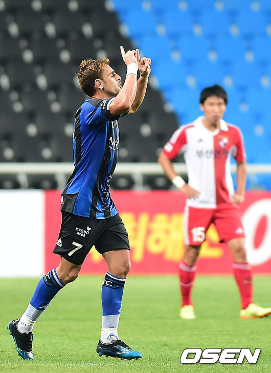 크 경기, '현대오일뱅크 K리그 클래식 2014' 23라운드 경기, 전반 인천 이보가 팀 두번째 골을 넣은 후 기뻐하고 있다.