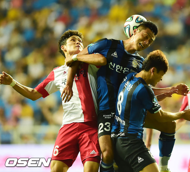 크 경기, '현대오일뱅크 K리그 클래식 2014' 23라운드 경기, 전반 부산 이경렬과 인천 남준재가 문전 공중볼 다툼을 하고 있다.