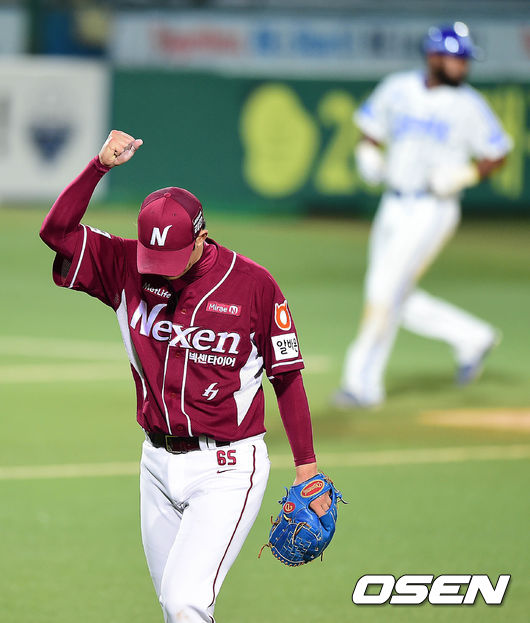 5회말 삼성 공격 2사 2루 상황 박해민을 중견수 플라이로 처리한 넥센 선발 김대우가 주먹을 불끈 쥐며 환호하고 있다.