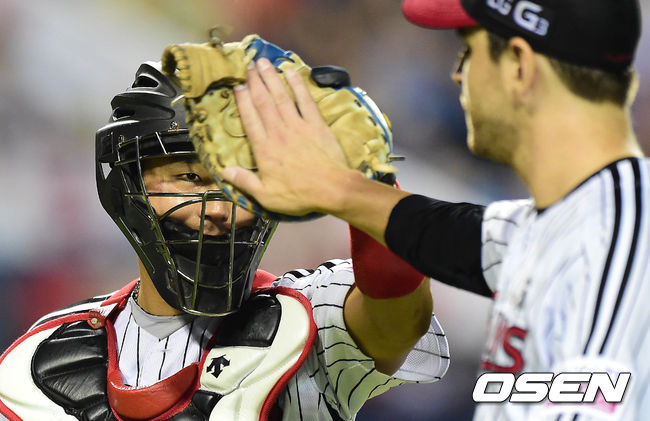 30일 오후 서울 잠실구장에서 열린 '2014 한국야쿠르트 세븐 프로야구' LG 트윈스와 롯데 자이언츠의 경기 5회초 2사 1,3루 박종윤을 외야플라이로 처리한 리오단과 최경철이 하이파이브를 하고 있다.