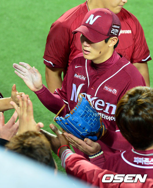 6회말 삼성 공격 1사 1루 상황에서 넥센 선발 김대우가 마운드를 내려오며 더그아웃 동료들과 인사를 나누고 있다.