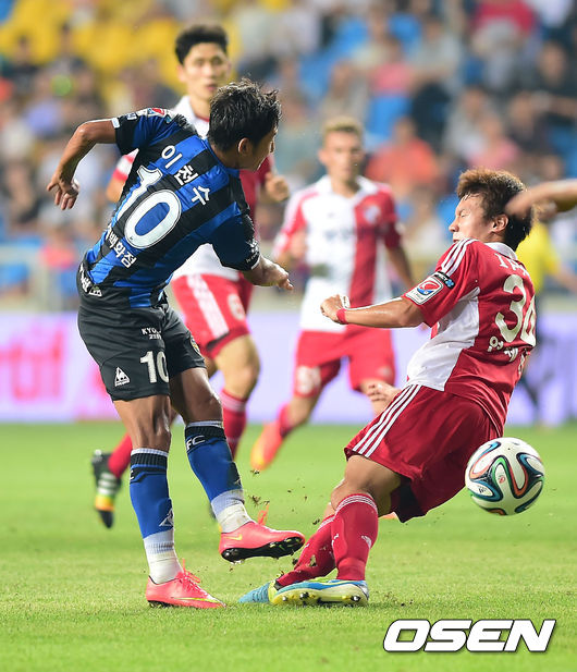크 경기, '현대오일뱅크 K리그 클래식 2014' 23라운드 경기, 후반 인천 이천수가 강슛을 날리던 도중 부산 연제민에게 발을 차이고 있다.