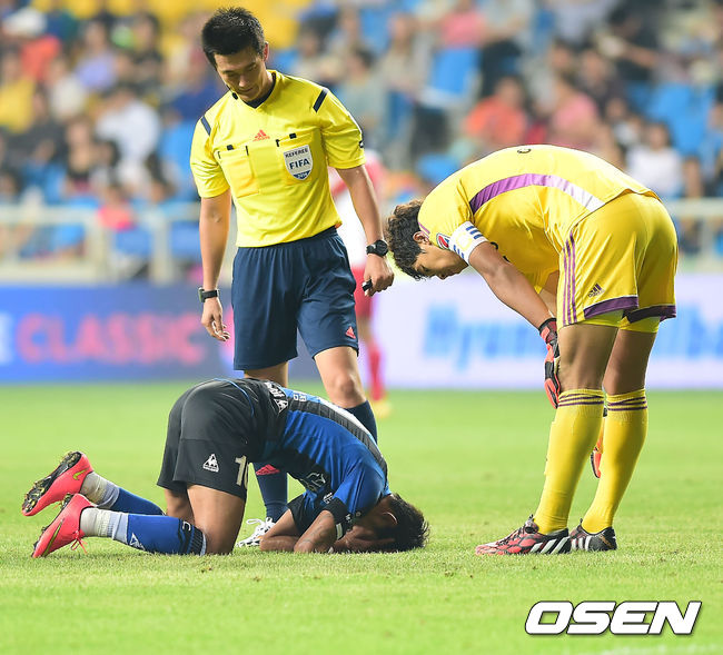 크 경기, '현대오일뱅크 K리그 클래식 2014' 23라운드 경기, 후반 인천 이천수가 강슛을 날리던 도중 부산 연제민에게 발을 차여 고통을 호소하자 부산 이범영이 다가와 상태를 살피고 있다.
