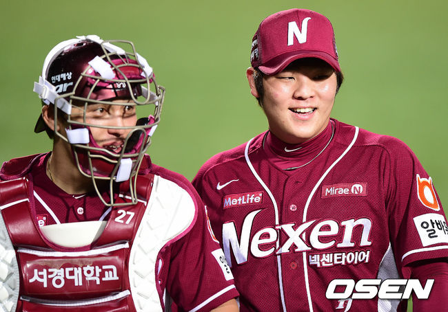 6회말 삼성 공격 2사 만루 상황 이지영을 내야 땅볼로 이끌며 무실점으로 이닝을 마무리지은 넥센 투수 한현희와 포수 박동원이 더그아웃으로 들어오며 미소짓고 있다.