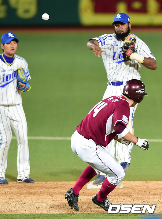 7회초 넥센 공격 무사 1, 2루 상황 문우람의 내야 땅볼 타구를 잡은 삼성 2루수 나바로가 주자 서건창을 2루에서 포스아웃 시킨 뒤 1루로 송구하고 있다.