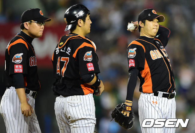 30일 오후 서울 잠실구장에서 열린 '2014 한국야쿠르트 세븐 프로야구' LG 트윈스와 롯데 자이언츠의 경기 7회말 2사 1루 장원준이 마운드를 내려가고 있다.
