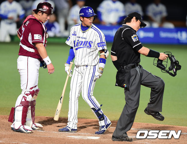 7회말 삼성 공격 선두타자로 나선 김상수가 다리를 내밀며 넥센 투수 한현희의 공에 맞자 우효동 주심이 몸 맞는 공이 아니라는 제스처를 취하고 있다.