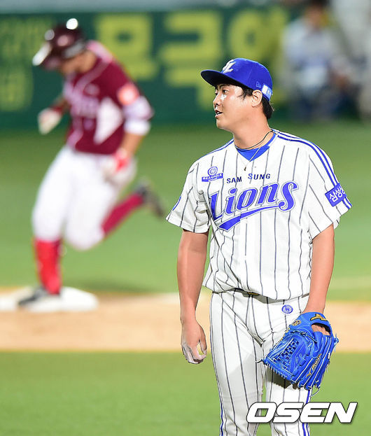 8회초 넥센 공격 2사 2, 3루 상황 서건창에게 좌월 3점포를 허용한 삼성 투수 안지만이 아쉬워하고 있다.