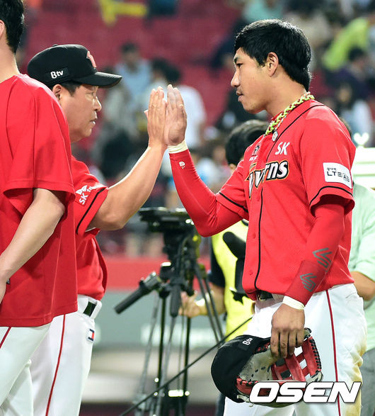 승리한 SK 이만수 감독이 오늘의 수훈갑 김강민과 하이파이브를 하고 있다./spjj@osen.co.kr
