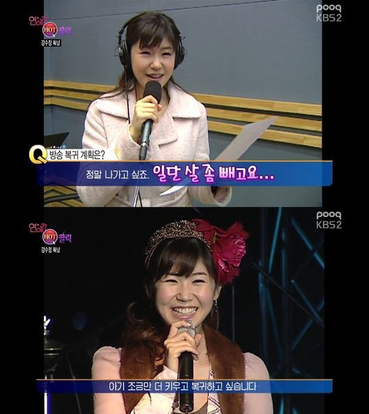 강수정은 30일 방송된 KBS 2TV '연예가중계'와의 인터뷰에서 "정말 방송 나가고 싶다. 살 좀 빼고 나가겠다"며 웃었다.