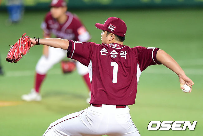 8회말 삼성 공격 2사 2, 3루 상황에서 마운드에 오른 넥센 투수 손승락이 힘차게 공을 뿌리고 있다.