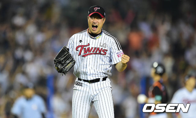 30일 오후 서울 잠실구장에서 열린 '2014 한국야쿠르트 세븐 프로야구' LG 트윈스와 롯데 자이언츠의 경기 종료 후 봉중근이 승리를 기뻐하고 있다.