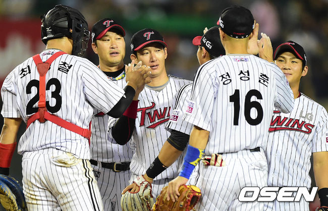 30일 오후 서울 잠실구장에서 열린 '2014 한국야쿠르트 세븐 프로야구' LG 트윈스와 롯데 자이언츠의 경기 종료 후 LG 선수들이 하이파이브를 하고 있다.
