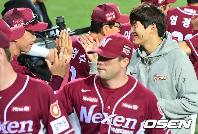 승리투수가 된 넥센 김대우가 코칭스태프와 인사를 나누고 있다./dreamer@osen.co.kr