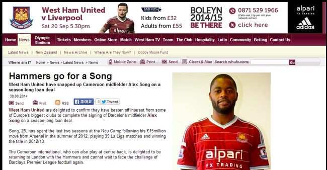 여름 이적시장 마감일을 앞두고 웨스트햄 유나이티드가 알렉스 송(27, 바르셀로나)을 임대로 영입했다.