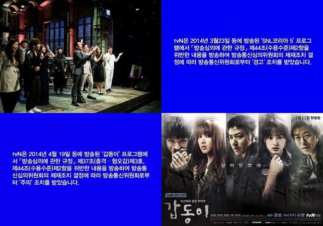 케이블채널 tvN '갑동이' 'SNL코리아'가 방송통신심의위원회(이하 방통심의위)로부터 법정제재를 받은 사실을 방송 화면을 통해 공지했다.