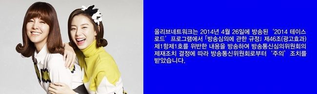 이날 정오 방송된 온스타일 '테이스티로드'도 방송에 앞서 '주의' 조치를 받은 사실을 공지했다. '테이스티로드'는 지난 4월 26일 방송된 내용이 「방송심의에 관한 규정」제46조(광고효과)제1항 제1호를 위반한 내용을 방송하여 '주의' 조치를 받았다.