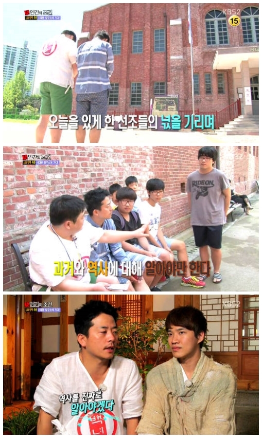지난 30일 오후 방송된 KBS 2TV 예능프로그램 ‘인간의 조건’은 ‘백년의 유산 찾기’ 첫 번째 이야기로 꾸며졌다. 김준호, 조우종, 정태호, 김준현, 개코, 김기리 등은 우리나라의 역사를 바로 알기 위한 5일간의 체험을 시작했다. 이들은 우리 음식과 의복의 변천사를 공부하고, 의미 있는 장소를 찾아 그 뜻을 기렸다.