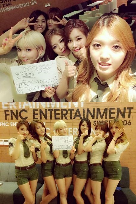 공개된 사진 속에는 '짧은 치마 유투브 뮤비 10000000 돌파'라고 써있는 종이를 들고 인증샷을 찍고 있는 AOA의 모습이 담겨있다. 제복으로 무대의상을 맞춰 입은 멤버들은 하나같이 미모를 과시해 눈길을 끈다.