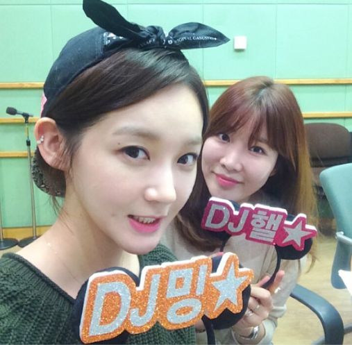 공개된 사진 속에는 각각 'DJ밍'과 'DJ핼'이라고 써있는 머리띠를 들고 있는 강민경과 이해리의 모습이 담겨있다. 두 사람은 나란히 화장기 연한 수수한 모습으로 청순한 미모를 뽐내 눈길을 끈다.