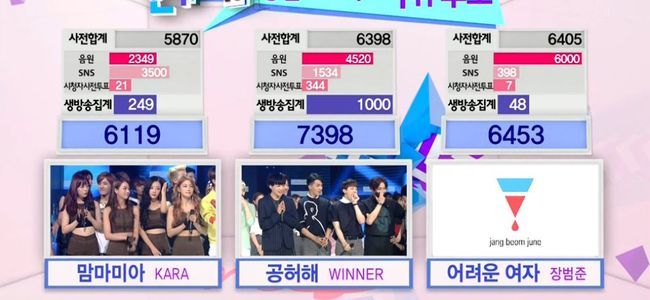 위너는 31일 오후 방송된 SBS 음악방송 '인기가요'에서 데뷔곡 '공허해'로 카라와 장범준을 제치고 1위에 올랐다. 지난 주에 이어 2주연속 정상의 기록이다.