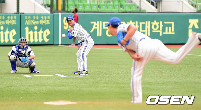 31일 오후 대구구장에서 열리는 '2014 한국야쿠르트 세븐 프로야구' 삼성 라이온즈와 넥센 히어로즈의 경기를 앞두고, 삼성 류중일 감독이 투수 윤성환의 공을 직접 타석에 서서 바라보고 있다.