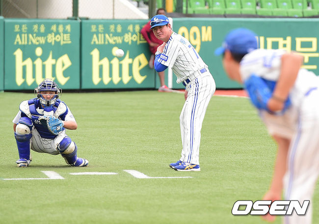 31일 오후 대구구장에서 열리는 '2014 한국야쿠르트 세븐 프로야구' 삼성 라이온즈와 넥센 히어로즈의 경기를 앞두고, 삼성 류중일 감독이 투수 윤성환의 공을 직접 타석에 서서 바라보고 있다.