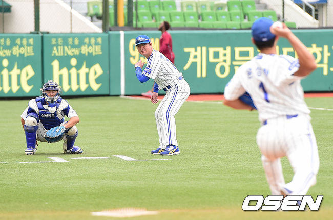 31일 오후 대구구장에서 열리는 '2014 한국야쿠르트 세븐 프로야구' 삼성 라이온즈와 넥센 히어로즈의 경기를 앞두고, 삼성 류중일 감독이 투수 윤성환의 공을 직접 타석에 서서 바라보고 있다.
