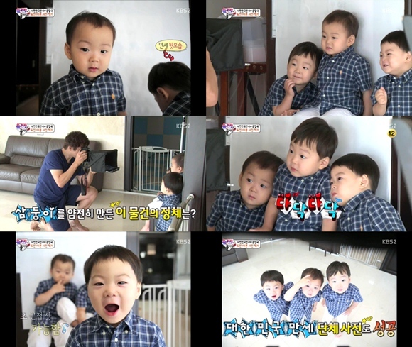 배우 송일국의 세쌍둥이 대한 민국 만세가 카메라 앞에서 애교를 발산했다.