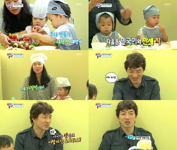 31일 오후 방송된 KBS 2TV 예능프로그램 '해피선데이-슈퍼맨이 돌아왔다'(이하 슈퍼맨이 돌아왔다)에서는 송일국이 세쌍둥이 대한 민국 만세와 학부모 참여 수업에 참석하는 모습이 그려졌다.