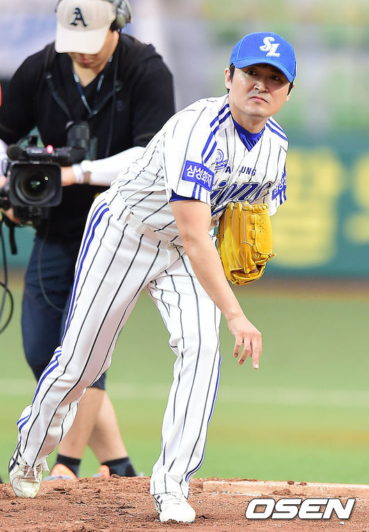 시구자로 나선 배우 임호가 힘차게 공을 뿌리고 있다.