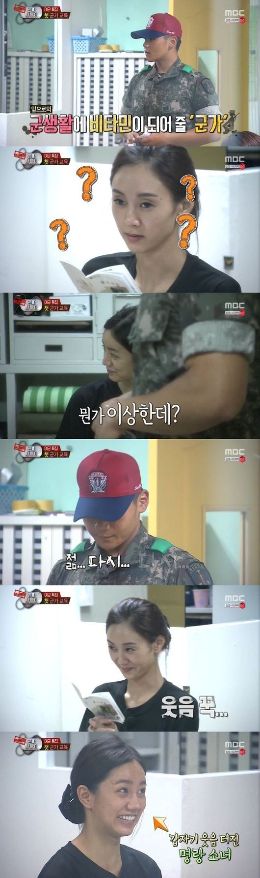 이날 갑자기 등장한 분대장은 '멋진 사나이', '전선을 간다' 등 군가 교육을 하겠다고 생활관에 등장했다. 모두가 긴장한 가운데 분대장이 먼저 노래를 불렀다. 그러나 그의 군가는 음이 틀렸고, 혜리-지나 등 가수 출신 훈련생은 웃음을 참지 못했다.