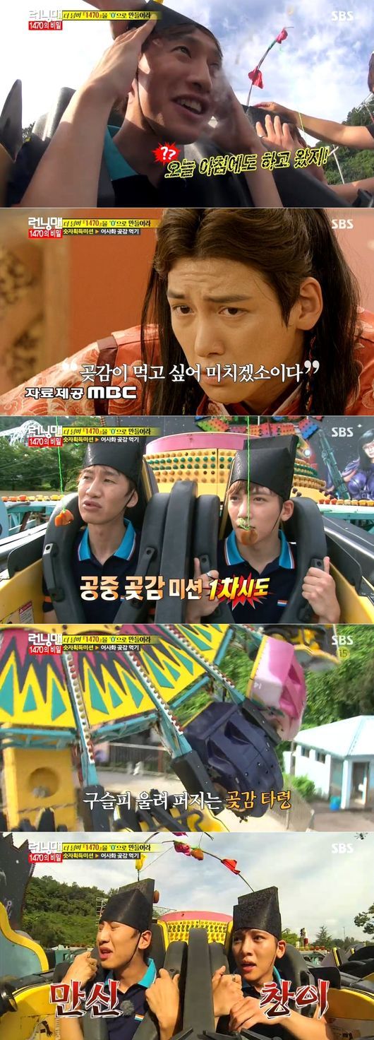 이광수와 지창욱은 31일 오후 방송된 SBS 예능프로그램 ‘일요일이 좋다-런닝맨’에서 놀이기구 ‘카오스’를 타며 어사화에 달린 곶감을 먹는 미션을 받았다.